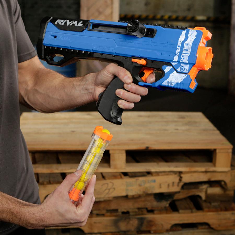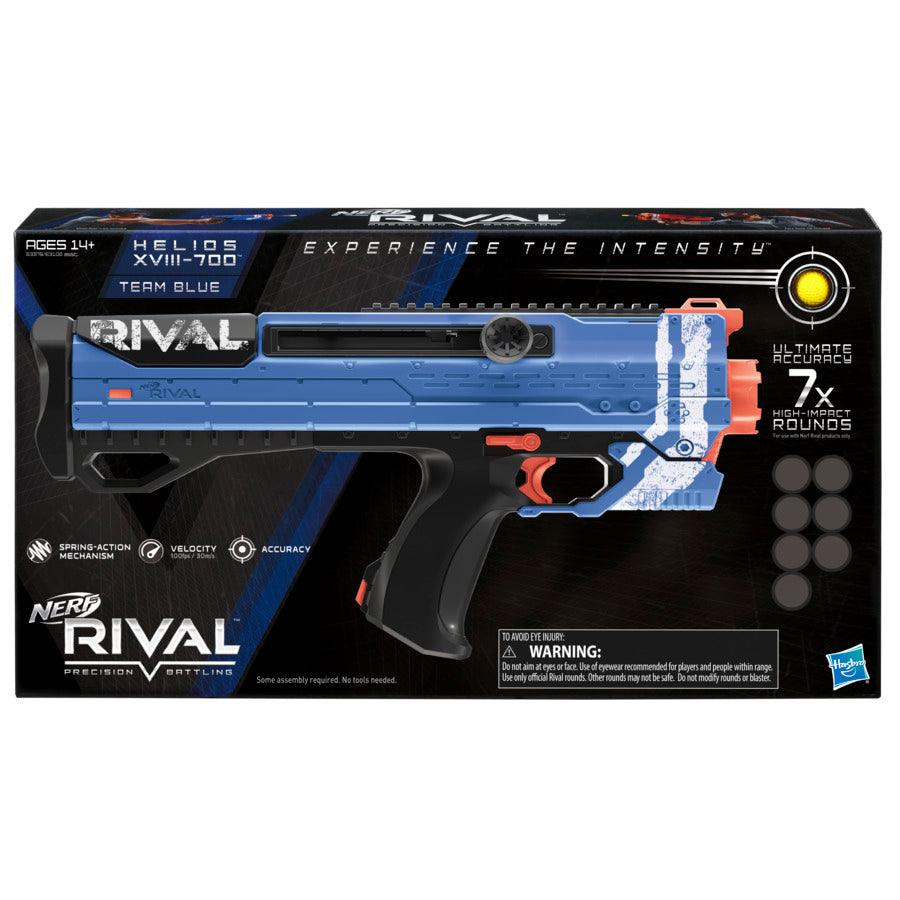 Gear up for intense Nerf Rival battles with the powerful Nerf Rival Helios XVIII-700, designed in striking Team Blue colors for competitive, high-precision play. This bolt-action blaster fires high-impact rounds at an incredible 100 feet per second (30 m/s)—all powered by you, with no batteries required. It includes an easy-load 7-round magazine and 7 Official Nerf Rival rounds, giving players fast reloads and nonstop action. The bolt can be positioned on either side of the blaster, making it perfect for both right-handed and left-handed battlers. Equipped with a spring-action mechanism, trigger lock, ready indicator, and a tactical rail for accessories, the Helios XVIII-700 offers accuracy, control, and customizable gameplay. Built for competitive battles and high-intensity play, this blaster delivers the power and performance Nerf Rival fans expect.